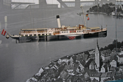 Nach unserem Mittagessen im Museumsrestaurant DoXX mit Sicht auf ständig startende und landende Zeppeline und Düsenjets vom Flughafen Friedrichshafen fuhr uns unser Bus zum Hafen, wo bereits die Seeschwalbe, unser Mahagonischiff wartete. Während der einstündigen Fahrt (nur für uns!) war immer ein Blick auf das Regenradar wichtig. Das Unwetter war angesagt für 14.20 Uhr, aber wie ein Wunder, es zog nicht weiter, sondern hing in der Schweiz fest und so war unsere Fahrt die volle Zeit ohne Regentropfen.