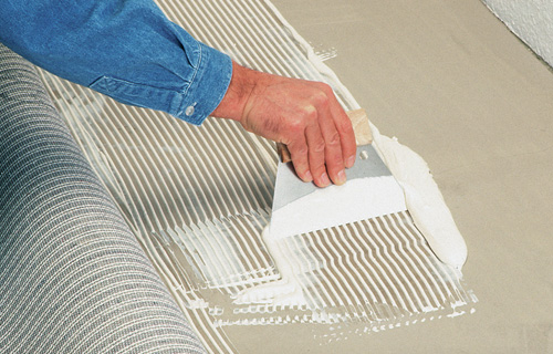 Falls Sie sich für das vollflächige Verkleben entscheiden, sollten Sie zunächst einen Tiefengrund auf den Boden auftragen und gut trocknen lassen. Danach schlagen Sie den Teppich zur Hälfte zurück und tragen mit einem Zahnspachtel gleichmäßig einen geeigneten Teppichkleber auf. Tragen Sie den Kleber nicht zu dick auf, da sich sonst Blasen bilden können.