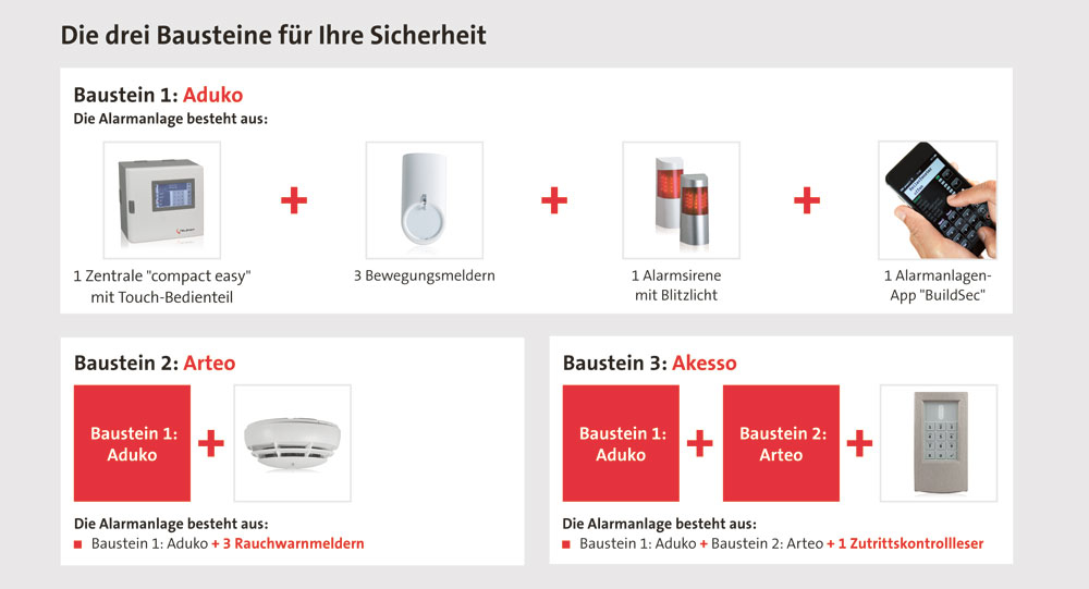 Das Einsteigerpaket Aduko schützt mit Sicherheitskomponenten wie drei Bewegungsmeldern vor Einbruch, Arteo zusätzlich vor Brand und Akesso bietet noch eine Zutrittskontrolle, sodass einzelne Bereiche im Haus nur von berechtigten Personen betreten werden können. Wer dies alles auch von unterwegs aus über sein Telefon oder Pad steuern möchte, kann die Alarmanlagen-App „BuildSec“ nutzen.
