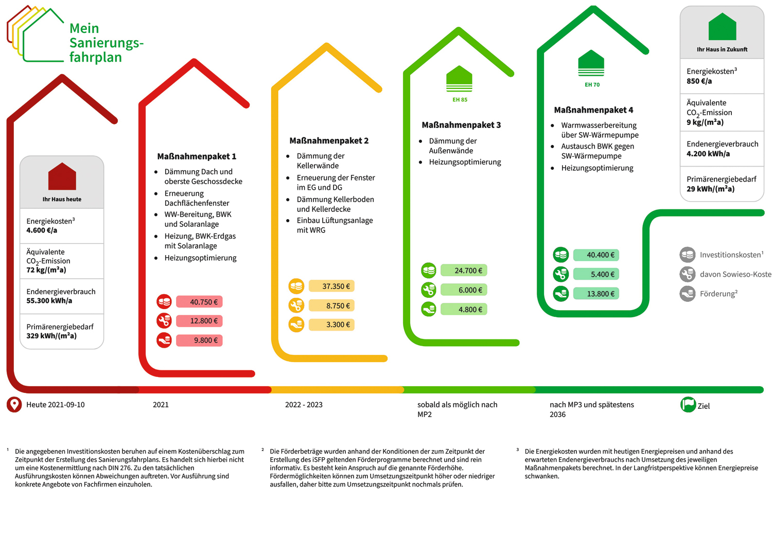 Als Ziel dieser unabhängigen Beratung durch den Energieexperten empfiehlt sich ein sogenannter individueller Sanierungsfahrplan (iSFP) für die Immobilie. Er bietet einen Überblick über Sanierungsmaßnahmen, Kosten, zeitliche Reihenfolge der Umsetzung und Fördermöglichkeiten.