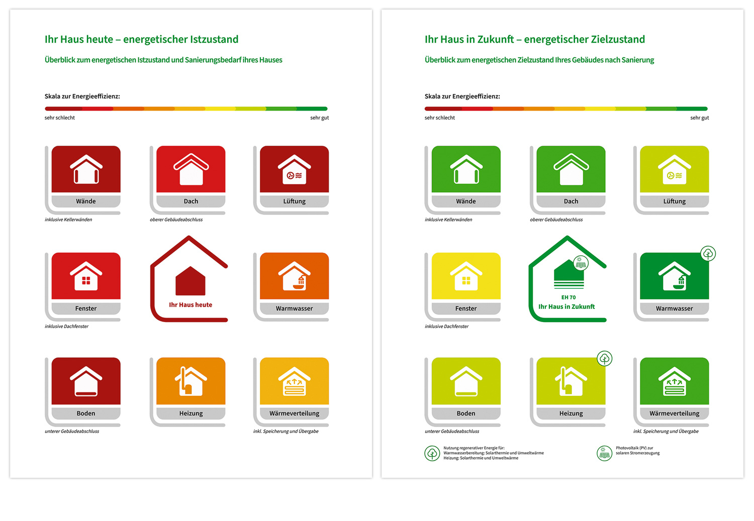 Grafische Darstellung im Sanierungsfahrplan zum Ist-Zustand und zum energetischen Zielzustand nach der Sanierung.