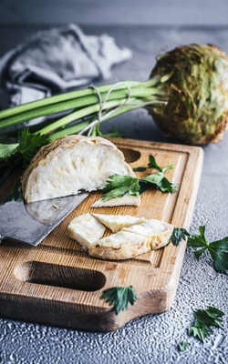 Sellerie ist ein wahrer Allrounder: vielfältig einsetzbar, passt er zu fast allem und lässt sich mit weiteren Gemüsesorten, Fisch, Fleisch und Geflügel kombinieren. Neben der Vielfältigkeit kann Sellerie mit Vitamin A, B, C und E punkten und wird durch den Ballaststoffgehalt zu einem gesunden Genuss. |